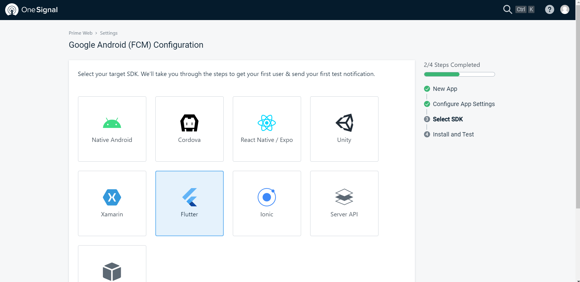 page, click the Android icon to launch the setup workflow.