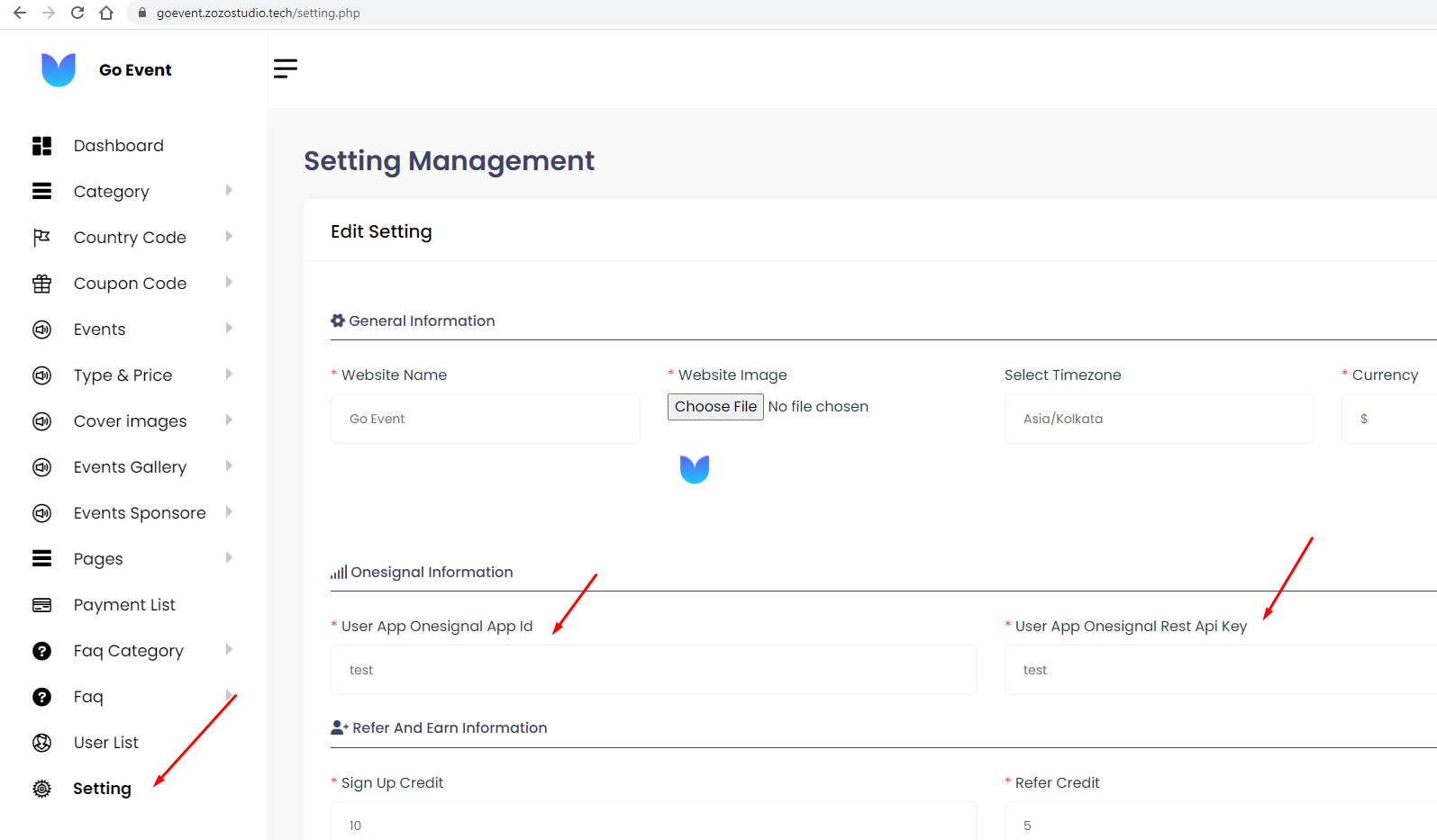 Step 8: Onesignal App ID & Rest Api Key paste it to admin setting tab